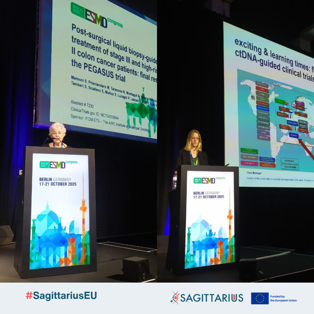 On Saturday, 18 October at 14:45, SAGITTARIUS Scientific Coordinator Dr. Silvia Marsoni (IFOM) presented the final results of the PEGASUS clinical trial during the “Proffered Paper Session 1: GI tumours, lower digestive”. The PEGASUS study, promoted by IFOM (Milan), is the clinical trial on which SAGITTARIUS is based. In fact, it involved over 100 patients to demonstrate that liquid biopsy could guide the personalization of the post-surgical therapeutic path for patients suffering from colon cancer. Dr. Marsoni’s talk, titled “Post-surgical liquid biopsy-guided treatment of stage III and high-risk stage II colon cancer patients: final results of the PEGASUS trial”, highlighted the clinical value of post-operative liquid biopsy in guiding treatment decisions for colon cancer patients.